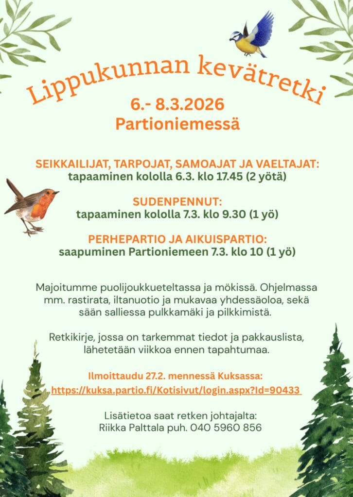 Etusivu Ajankohtaiset uutiset Tietoa lippukunnasta Huoltajille Ryhmät Tapahtumat Yhteystiedot TULEVIA TAPaHTUMia 6.-8.3. lippukuntaretki Koko lippukunna yhteinen retki Partioniemessä. Ilmoittaudu mukaan Kuksassa: https://kuksa.partio.fi/Kotisivut/login.aspx?Id=90433 23.4.2026 Yrjönpäivä Yrjönpäivä, lisätietoa tulossa!